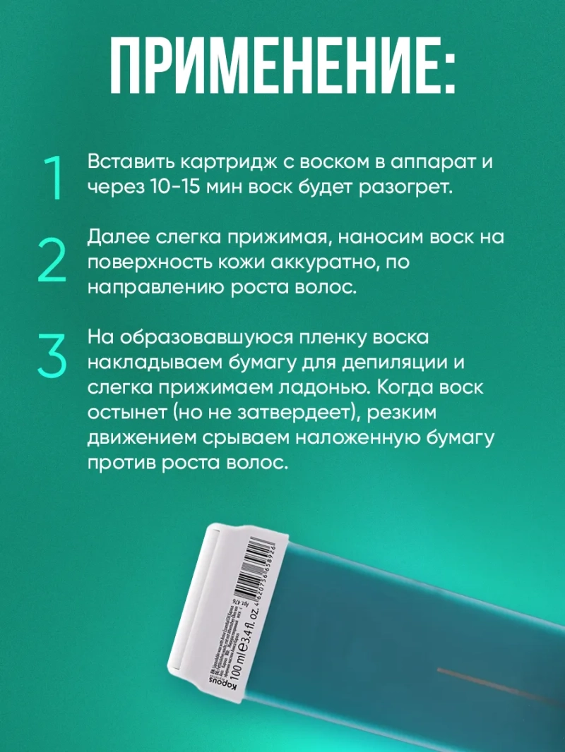 Хотите, чтобы ваша кожа стала безупречно гладкой и шелковистой? Тогда вам обязательно стоит попробовать наш новый воск для депиляции с экстрактами и эфирными маслами, который обеспечивает идеальное удаление волос и одновременно заботится о здоровье вашей кожи. Этот жирорастворимый воск создан с добавлением натуральных компонентов, что делает его идеальным выбором для всех типов кожи, включая самую чувствительную. Наш воск для депиляции обладает кремообразной текстурой и прекрасно растворяется на коже, что делает процесс депиляции максимально комфортным и эффективным. Благодаря широкой роликовой системе, вы сможете легко и быстро наносить воск на поверхность кожи, а также удалять даже самые тонкие и пушковые волосы. Аромат воска просто восхитителен: эфирные масла и экстракты придают ему легкий и приятный запах, который останется на вашей коже после депиляции. С помощью нашего воска для депиляции вы получаете не только гладкую кожу, но и ухаживающий эффект. Эфирные масла и экстракты, входящие в состав, активно питают и увлажняют кожу во время процедуры, что делает ее здоровой и красивой. Воск не оставляет неприятной липкости после использования, позволяя вам чувствовать себя комфортно и свежо в течение всего дня. Рекомендуется использовать один воск в картридже на одного клиента, чтобы гарантировать максимальное качество депиляции и получать исключительный результат каждый раз. Способ применения очень прост: вставьте картридж с воском в аппарат, подождите 10-15 минут до разогрева, затем аккуратно нанесите воск на кожу по направлению роста волос. После охлаждения воска, резким движением удалите бумагу против роста волос. Ваша кожа станет гладкой и ухоженной! Не упустите возможность попробовать наш воск для депиляции с экстрактами и эфирными маслами. Он станет вашим незаменимым помощником в поддержании красоты и здоровья кожи. Сделайте свой выбор в пользу надежного и эффективного воска для депиляции, и вы никогда не захотите менять его на другой продукт!