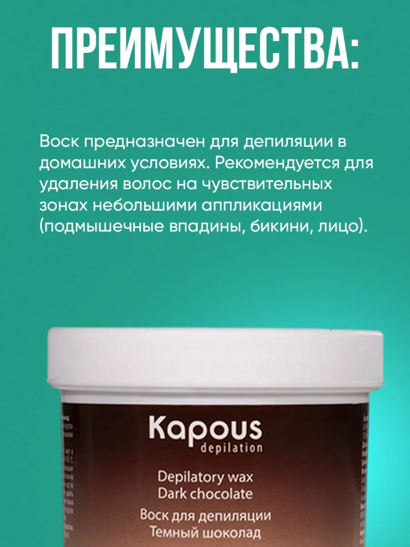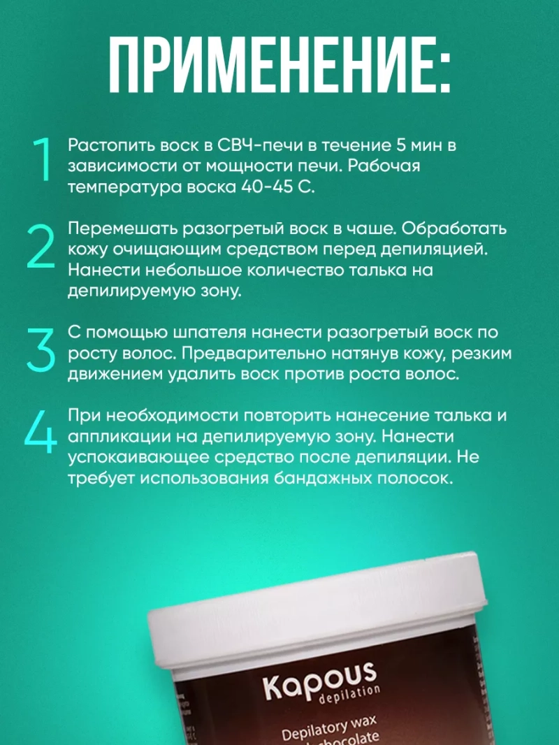 Воск для депиляции для разогрева в СВЧ (Темный шоколад): Хотите иметь шелковистую и гладкую кожу, не выходя из дома? Представляем вам наш новый элементарный способ депиляции - воск для разогрева в СВЧ-печи вкусного оттенка темного шоколада. Наш воск был специально разработан для удобства использования в домашних условиях и станет вашим верным помощником при удалении волос на самых чувствительных зонах, таких как подмышечные впадины, бикини и лицо. Благодаря уникальному составу, включающему Glyceryl Rosinate, Naphthenic oils, Ethylene/VA Copolymer, Beeswax, Stearic Acid, CI 20285, наш воск обеспечивает эффективное удаление волос при минимальном дискомфорте. Применение воска - процедура, которая ранее требовала посещения салона красоты. Но теперь вы можете попробовать все преимущества домашней депиляции благодаря нашему удобному разогреваемому воску. Способ применения прост и понятен даже для новичков в депиляции. Прежде чем начать процедуру, рекомендуется очистить кожу специальным очищающим средством для депиляции. Затем нанесите небольшое количество талька на область депиляции, чтобы обеспечить максимальную эффективность воска. С помощью шпателя нанесите нагретый воск на кожу в направлении роста волос. Предварительно натянув кожу, резким движением удалите воск против роста волос. Воск для разогрева в СВЧ-печи имеет рабочую температуру воска 40-45 градусов, которую легко достичь за считанные минуты в вашей СВЧ-печи. А чтобы процесс депиляции стал еще более комфортным, мы рекомендуем использовать после депиляции успокаивающее средство, которое смягчит кожу и предотвратит возможные раздражения. Специально разработанный для домашней депиляции, наш воск не требует использования бандажных полосок, что позволяет сэкономить ваше время и средства. Забудьте о болезненных и затратных процедурах депиляции и попробуйте наше новое современное решение - воск для депиляции для разогрева в СВЧ. Убедитесь сами в его эффективности и удобстве использования!