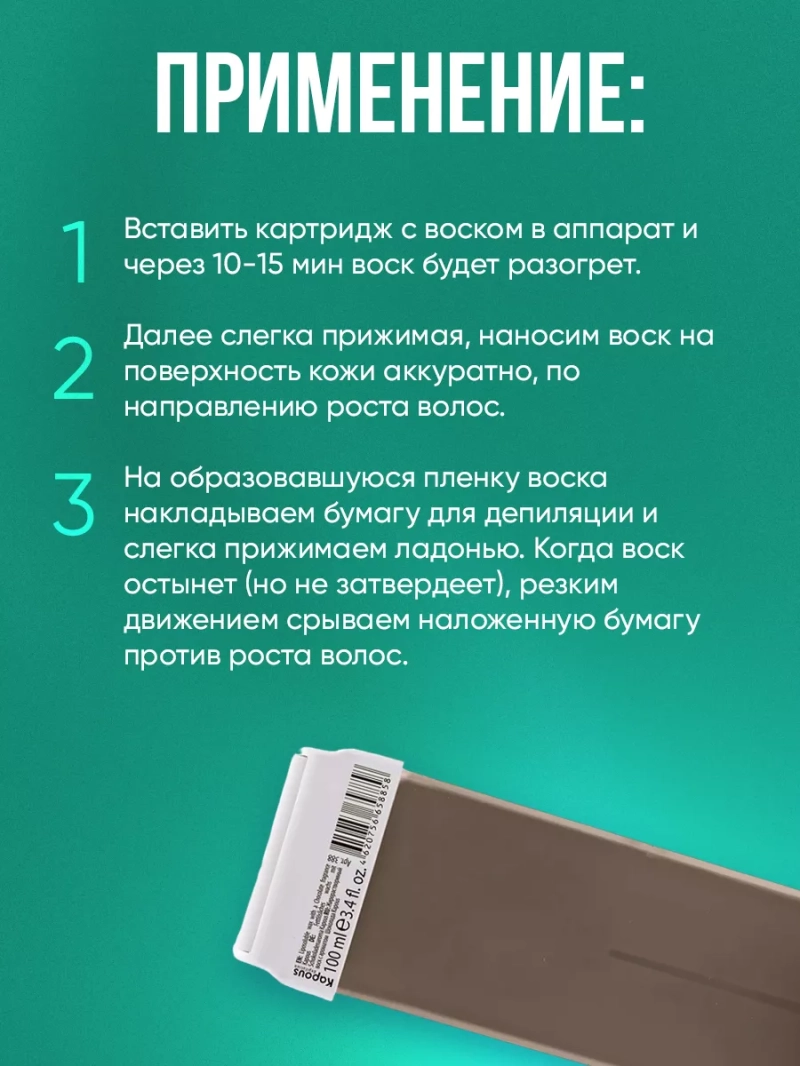 Жирорастворимый воск с ароматом Шоколада и широким роликом - это настоящий спаситель для вас после бритья. Идеально подходит для коротких и жестких волос, этот кремообразный воск обеспечивает гладкую и мягкую кожу без всякой липкости. Его специально разработанная формула обволакивает каждый волос в плотном и густом слое, глубоко удаляя его с корнем.Наш воск с ароматом Шоколада прекрасно подходит для загорелой или смуглой кожи, создавая ощущение приятных и нежных ноток шоколада на вашей коже. Этот уникальный аромат дарит вам настоящее наслаждение во время процедуры депиляции.Особая плотная консистенция этого воска требует немного больше времени для разогрева, но вы будете рады, что потратили этот дополнительный шаг. Вам просто нужно вставить картридж с воском в аппарат, и через 10-15 минут он станет идеально разогретым, готовым к использованию.Наносится этот воск плотным слоем на поверхность кожи аккуратно и в направлении роста волос. Затем наложите специальную депиляционную бумагу на воск, и слегка прижмите ладонью. Когда воск остынет (но не затвердеет), вы можете резким движением снять бумагу против роста волос. Результат будет невероятно гладкой и нежной кожей на протяжении долгого времени. Компоненты этого воска обеспечивают его эффективность и приятный аромат.Рекомендуется использовать один картридж воска на одного клиента, чтобы достичь наилучших результатов. Сочетание качественных ингредиентов и эффективного дизайна ролика делает этот воск идеальным выбором для домашней или профессиональной депиляции.Не упустите возможность попробовать этот удивительный воск с ароматом Шоколада и широким роликом. Он позволит вам наслаждаться гладкой и мягкой кожей, не беспокоясь о липкости или нежелательных волосах. Закажите его прямо сейчас и почувствуйте разницу с первого применения!