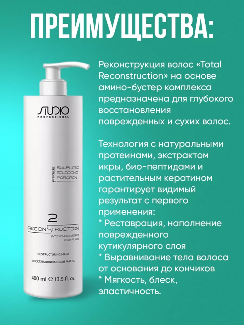 Реконструкция волос Total Reconstruction на основе амино-бустер комплекса предназначена для глубокого восстановления поврежденных и сухих волос. Технология с натуральными протеинами, экстрактом икры, био-пептидами и растительным кератином гарантирует видимый результат с первого применения: * Реставрация, наполнение поврежденного кутикулярного слоя * Выравнивание тела волоса от основания до... Реконструкция волос Total Reconstruction на основе амино-бустер комплекса предназначена для глубокого восстановления поврежденных и сухих волос. Технология с натуральными протеинами, экстрактом икры, био-пептидами и растительным кератином гарантирует видимый результат с первого применения: * Реставрация, наполнение поврежденного кутикулярного слоя * Выравнивание тела волоса от основания до кончиков * Мягкость, блеск, эластичность. 1 шаг: Восстанавливающий бессульфатный шампунь №1 для мягкого очищения всех типов волос, в том числе самых тонких. 2 шаг: Восстанавливающая маска №2 + амино-бустер №3 глубоко воздействуют на внешний слой волоса, проникают глубоко в чешуйки, увлажняют и питают волосы изнутри. Состав: Aqua (water), cetearyl alcohol, cetrimonium chloride, phenoxyethanol, butyrospermum parkii butter (butyrospermum parkii (shea) butter), behentrimonium chloride, parfum (fragrance), butylene glycol, caviar extract, ethylhexylglycerin, isopropyl alcohol, hydroxycitronellal, hexyl cinnamal, leuconostoc/radish root ferment filtrate, citric acid. Способ применения: смешать восстанавливающий бустер №3 с восстанавливающей маской №2 в пропорции 1:5 до получения кремообразной эмульсии. Равномерно нанести на чистые, подсушенные волосы по всей длине. Оставить на 10 минут с воздействием дополнительного тепла. Мягко промассировать волосы для поглощения активных аминокислот, тщательно смыть. В завершение процедуры нанести на влажные волосы восстанавливающий спрей №4, выполнить укладку.