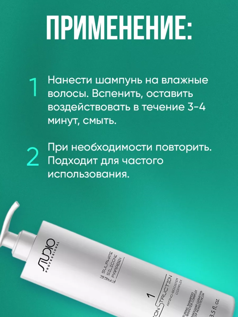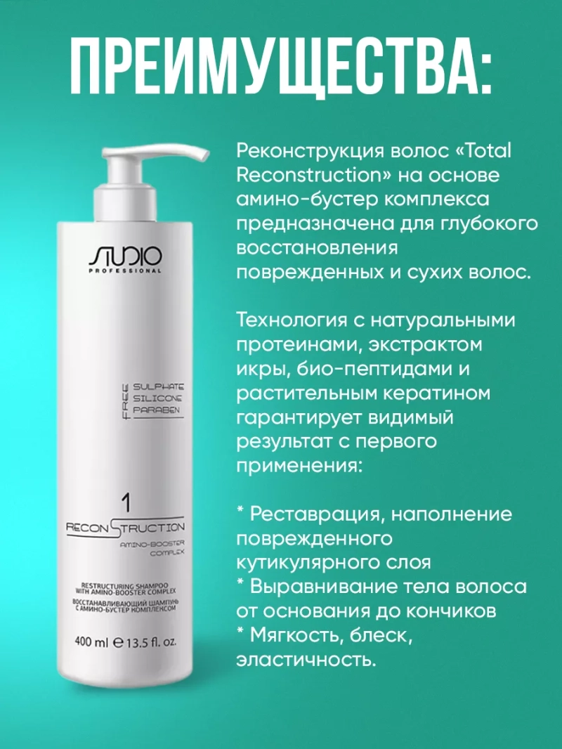 Реконструкция волос Total Reconstruction на основе амино-бустер комплекса предназначена для глубокого восстановления поврежденных и сухих волос. Технология с натуральными протеинами, экстрактом икры, био-пептидами и растительным кератином гарантирует видимый результат с первого применения: * Реставрация, наполнение поврежденного кутикулярного слоя * Выравнивание тела волоса от основания до... Реконструкция волос Total Reconstruction на основе амино-бустер комплекса предназначена для глубокого восстановления поврежденных и сухих волос. Технология с натуральными протеинами, экстрактом икры, био-пептидами и растительным кератином гарантирует видимый результат с первого применения: * Реставрация, наполнение поврежденного кутикулярного слоя * Выравнивание тела волоса от основания до кончиков * Мягкость, блеск, эластичность. 1 шаг: Восстанавливающий бессульфатный шампунь №1 для мягкого очищения всех типов волос, в том числе самых тонких. 2 шаг: Восстанавливающая маска №2 + амино-бустер №3 глубоко воздействуют на внешний слой волоса, проникают глубоко в чешуйки, увлажняют и питают волосы изнутри. Состав: Aqua (water), sodium c14-16 olefin sulfonate, cocamidopropyl betaine, sodium cocoamphoacetate, sodium chloride, acrylates copolymer, phenoxyethanol, coco-glucoside, parfum (fragrance), glycol distearate, citric acid, glycerin, butylene glycol, pisum sativum (pea) peptide, guar hydroxypropyltrimonium chloride, caviar extract, ethylhexylglycerin, hydroxycitronellal, wheat amino acids, soy amino acids, leuconostoc/radish root ferment filtrate, hexyl cinnamal, arginine hcl, serine, threonine, benzyl alcohol, potassium sorbate, sodium benzoate. Способ применения: Нанести шампунь на влажные волосы. Вспенить, оставить воздействовать в течение 3-4 минут, смыть. При необходимости повторить. Подходит для частого использования. В завершение процедуры нанести на влажные волосы восстанавливающий спрей №4, выполнить укладку.